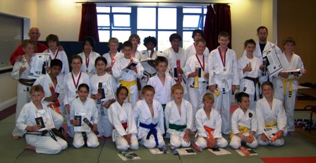 Proud youngsters from the over 10s showing off their new belts